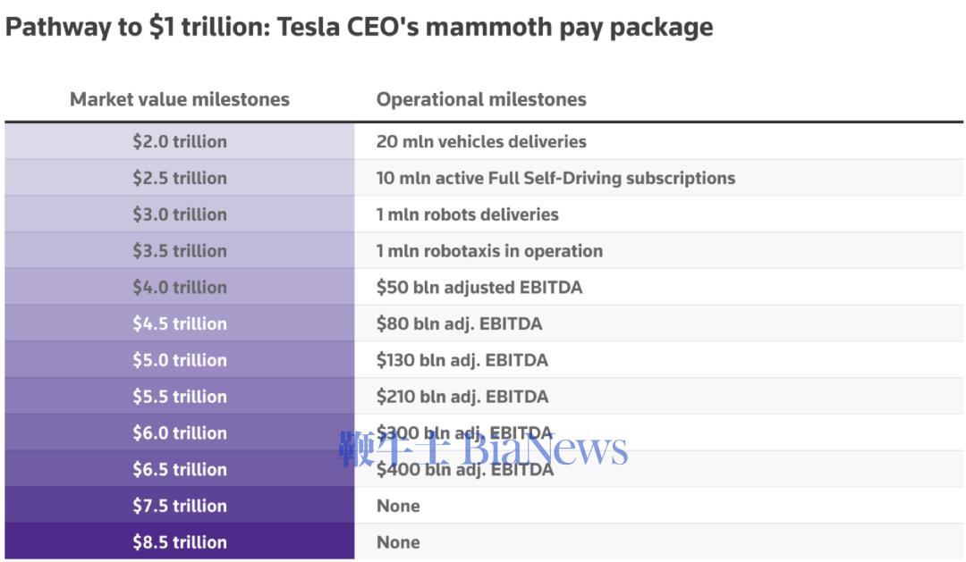 刻下特斯拉的市值在1.1万亿好意思元摆布,这意味着马斯克需要在改日十年推动特斯拉股价达到刻下的八倍。从市值1万亿好意思元飙升到8.5万亿好意思元,特斯拉市值每达到一个事迹里程碑,马斯克就不错得回353万股的期权。