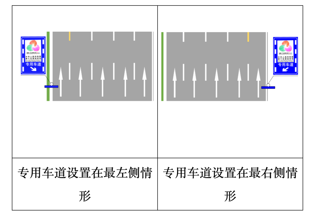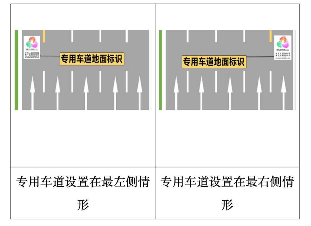 十五运会和残特奥会专用车说念设置在说念路顺行看法最左侧或最右侧活泼车说念,由专用车说念标线、大地标记和秀雅构成,具体神色如下: